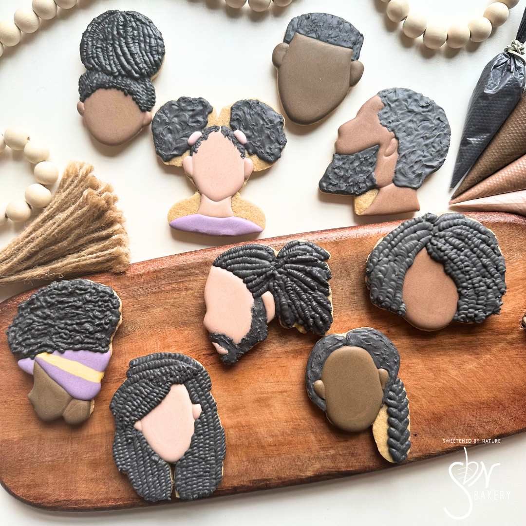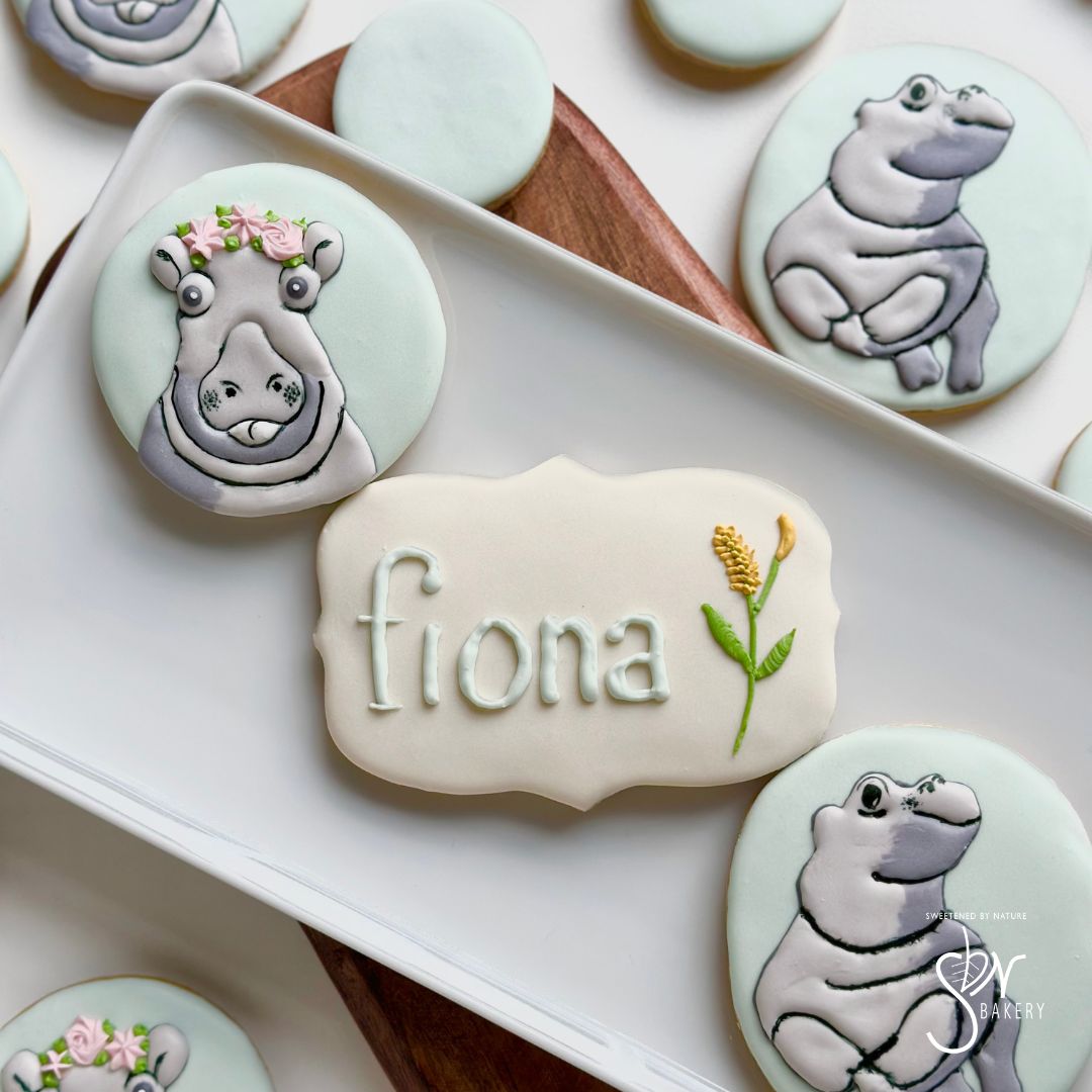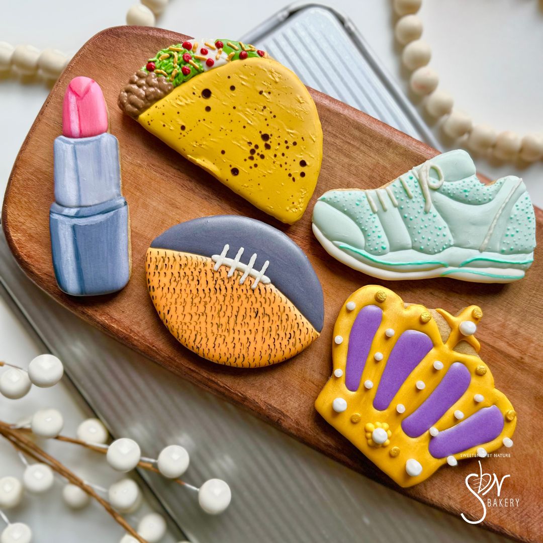 All cookies are individually heat-sealed and placed in a bakery box adorned with a bow or tag. Custom sets start at $55/dozen and are sold in increments of 12.